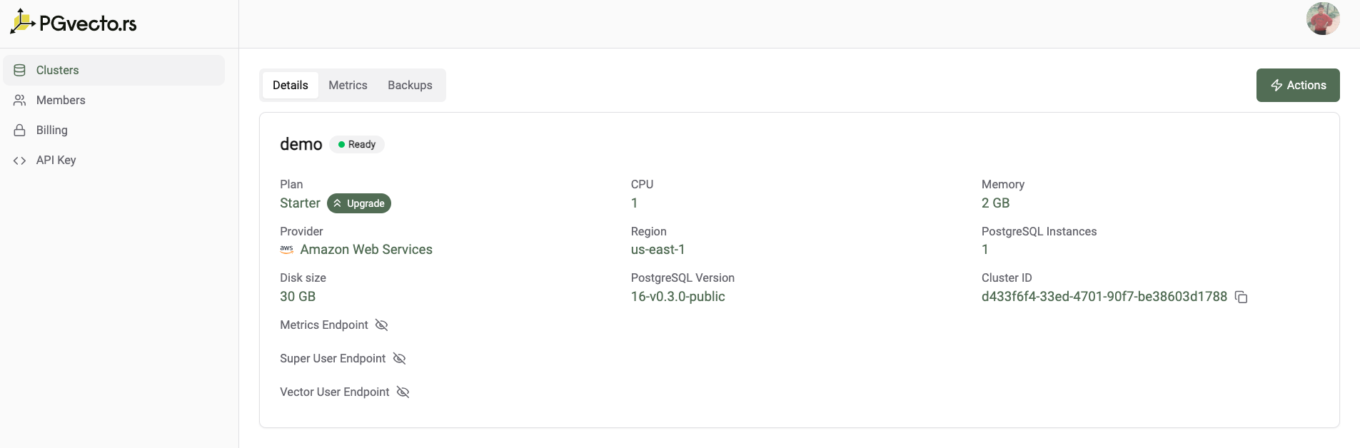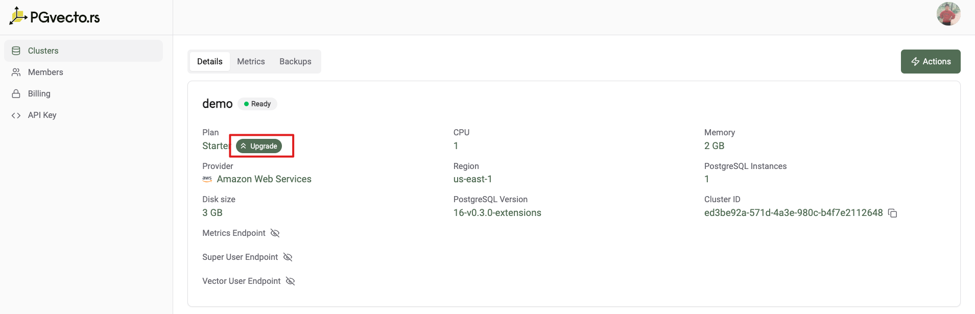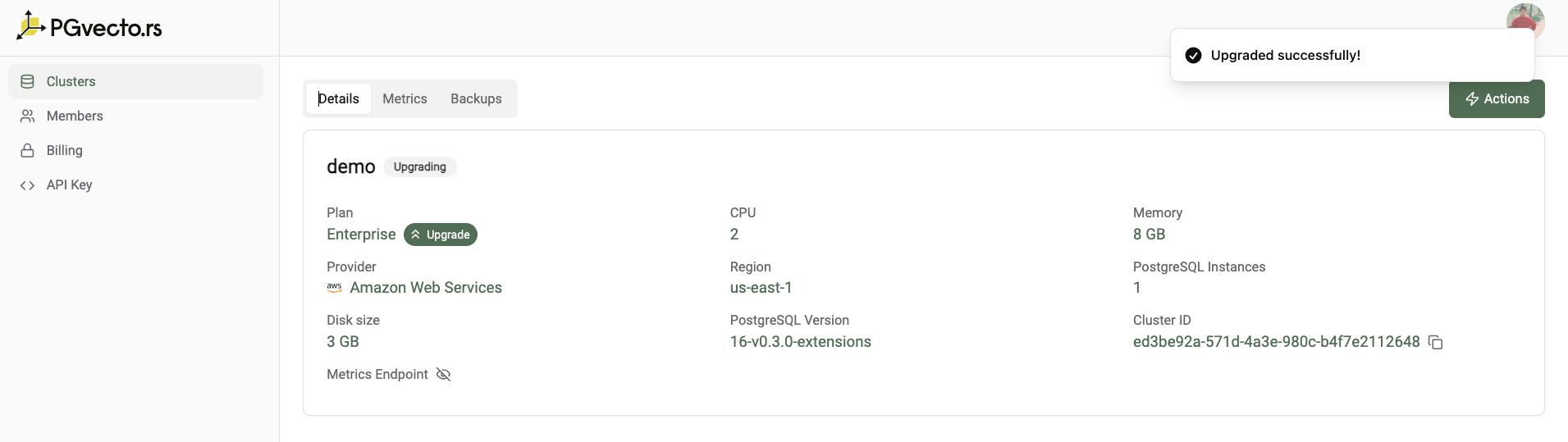 After submitting the upgrade request, the cluster will be in the Upgrading status. The cluster will be unavailable during the upgrade process. The upgrade process may take a few minutes to complete. After the upgrade process is completed, the cluster will be in the Ready status. And the cpu, memory will be updated to the new server resource, and the storage will remain the same.