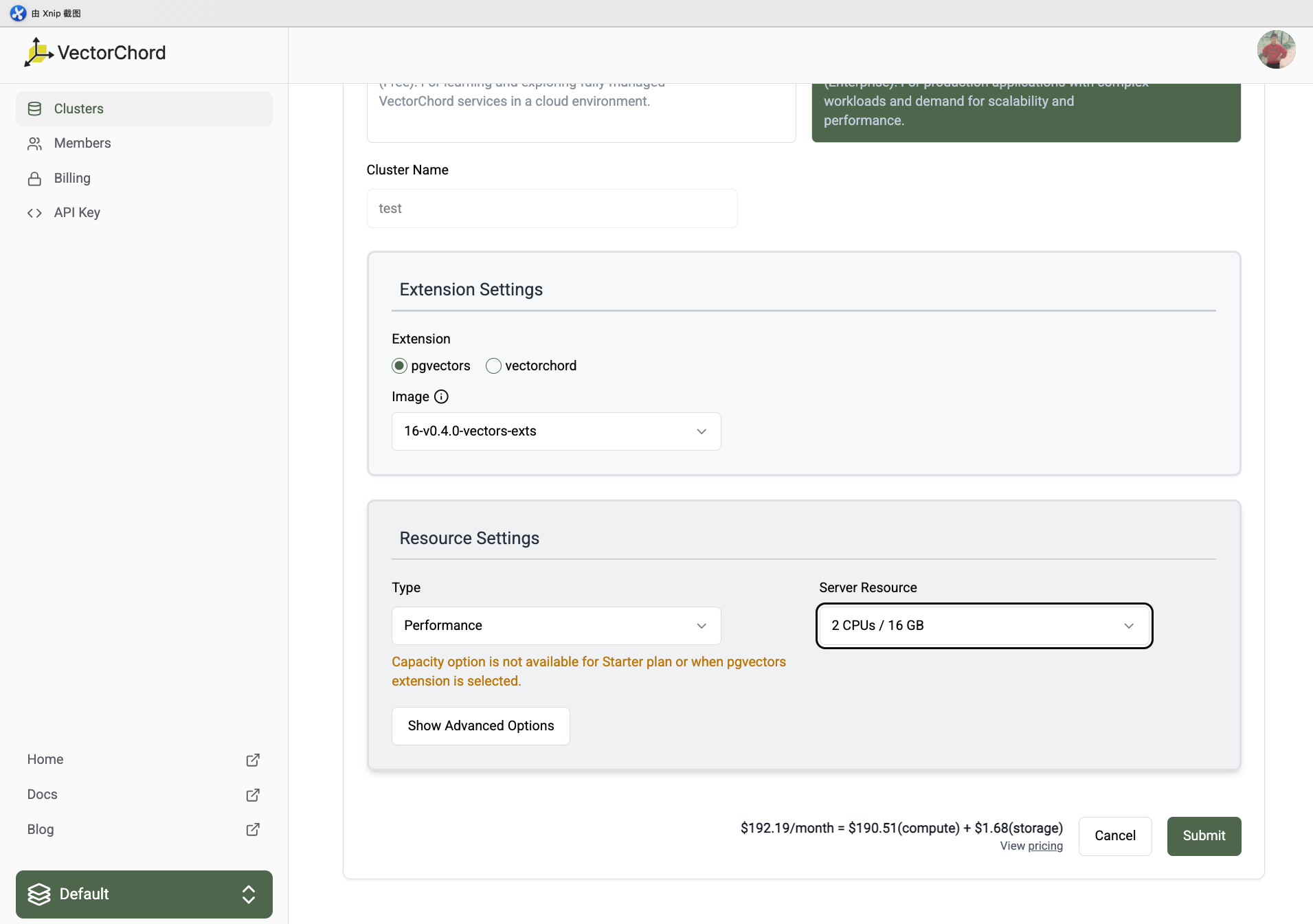 In the upgrade page, you can select the new plan and server resource. The price will be calculated based on the new server resource. Click the Submit button to upgrade the cluster.