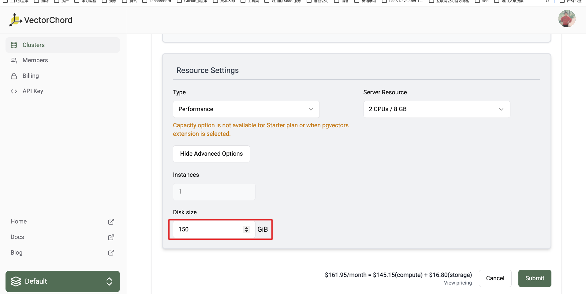 In the upgrade page, you can insert the new disk size in advanced options. The price will be calculated based on the new storage size. Click the Submit button to upgrade the cluster.
